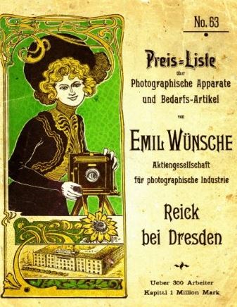 Emil Wünsche Reick b. Dresden. Hergestellt wurden verschiedene Kameras im Zeitraum 1887 - 1909, danach erfolgte der Zusammenschluss der Firmen Wünsche, Hüttig und Krügener zu ICA