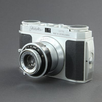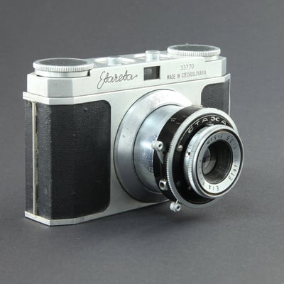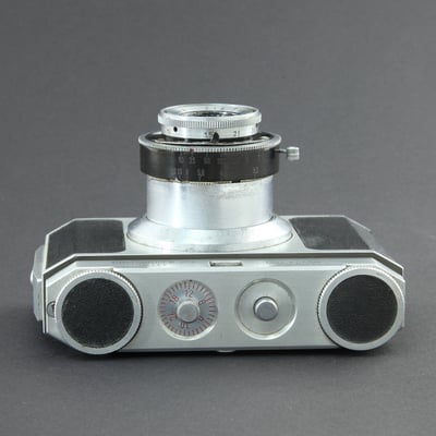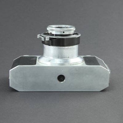 Tubenkamera für 135er Film (24 x 36mm) Die früh gefertigten Modelle trugen auf dem Filmtansportknopf eine Prägung, später hergestellte wurden mit einer Belederung versehen.